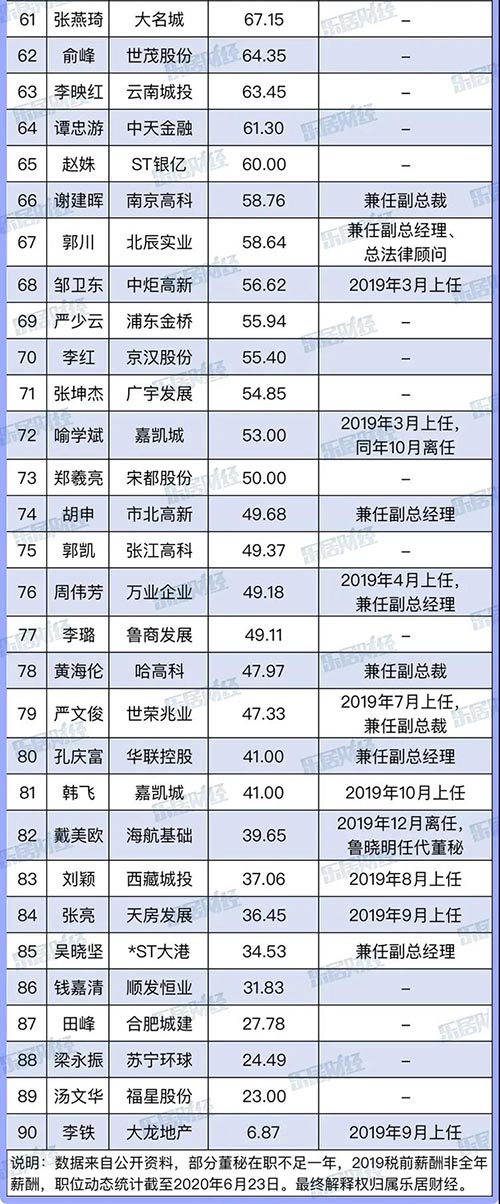 同為董秘,薪酬兩極分化嚴(yán)重。若排除2019年9月上任的大龍地產(chǎn)董秘李鐵,90位A股上市房企董秘中,最低薪酬在23萬(wàn)左右,與排在榜首的明星董秘相差近24倍。