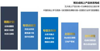 博志成地產(chǎn)學(xué)堂課經(jīng)過不斷完善升級,已經(jīng)逐步形成了領(lǐng)跑計劃、專項(xiàng)訓(xùn)練營、專題系列課、主題課程及合作課程五大線上產(chǎn)品體系。