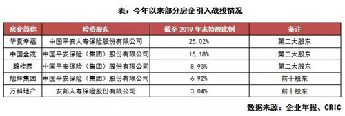 特別是近年來萬科、保利、招商蛇口等房企均紛紛引入險資,“地產(chǎn)+險資”的模式越來越普遍。從房企持股情況來看,險資是部分房企重要股東構成,中國平安已經(jīng)成為華夏幸福、中國金茂、碧桂園等房企的第二大股東。其中,華夏幸福2018年首次引入中國平安,從2019年報可以發(fā)現(xiàn),中國平安在華夏幸福的持股例比例已經(jīng)達25.02%。對于房企來說,引入險資作為戰(zhàn)投將不僅能緩解短期資金壓力,同時也利好于企業(yè)的長期融資,通過與金融資本相結(jié)合,獲得低成本資金。