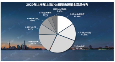 在2020年上半年的辦公租賃市場中,租金在3元/㎡·天以下的辦公項目成為最受關(guān)注的目標(biāo),需求占比達(dá)到57.01%,此租金段的占比需求相比2019年上半年略有下滑。浦東、閔行和徐匯是這個租金段最受關(guān)注的區(qū)域。而8元/㎡·天以上的高端租金需求相比2019年上半年則有一定幅度增長,需求占比達(dá)到8.94%,能承受高昂租金的客戶更青睞把尋址目標(biāo)放在長寧、徐匯和浦東。