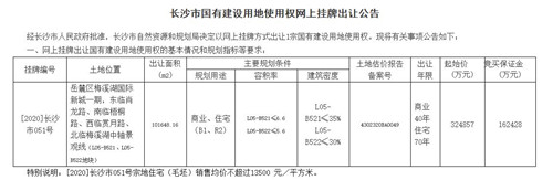 地塊出讓公告顯示,該地塊掛牌編號(hào)[2020]長(zhǎng)沙市051號(hào),為岳麓區(qū)梅溪湖國際新城一期,東臨肖龍路、南臨梧桐路、西臨賞月路、北臨梅溪湖中軸景觀線(L05-B521、L05-B522地塊),地塊出讓面積101648.16平方米,規(guī)劃用途為商業(yè)和住宅,該地塊起始價(jià)格為324857萬元,競(jìng)買保證金162428萬元,地塊樓面起始價(jià)為5300元/平方米。按照計(jì)劃,該地塊將于7月29日正式出讓。