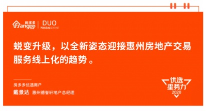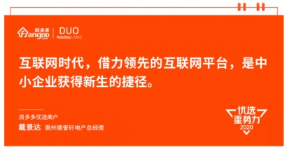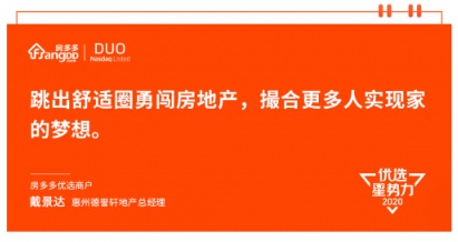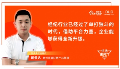 2017年戴景達(dá)第一次與房多多接觸,“房多多在惠州交易服務(wù)平臺中占據(jù)領(lǐng)導(dǎo)位置,擁有非常強(qiáng)的技術(shù)和品牌,對合作商戶同時(shí)能給予充分的尊重和成長幫助。對于我們想要自由發(fā)展的中小房地產(chǎn)公司來說,是非常好的合作伙伴! 戴景達(dá)經(jīng)過多方了解后給出了這樣的評價(jià),隨即與房多多開啟了長期合作之旅。