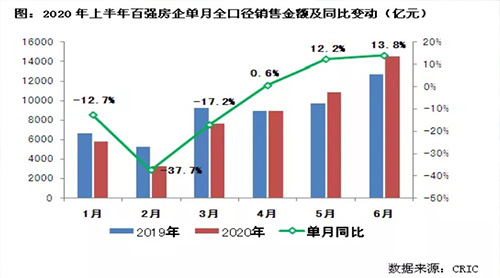 尤其是2020年6月,百強房企單月實現(xiàn)全口徑銷售金額14517.2億元,環(huán)比增長33%。單月業(yè)績同比逐月回升,自4月轉正后進一步提升至13.8%,復蘇跡象明顯。