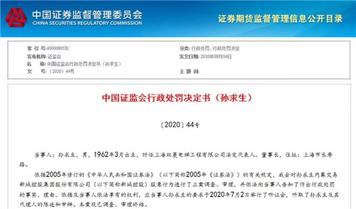 據(jù)證監(jiān)會官方網(wǎng)站消息,8月4日,證監(jiān)會發(fā)布〔2020〕44號行政處罰決定書(孫求生)。決定書顯示,與新城控股實際控制人王振華認識十幾年的上海雙菱電梯工程有限公司法定代表人、董事長孫求生在獲知王振華猥褻兒童事件后突擊賣出持有的50000股新城控股股票。