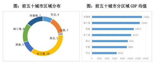 從經(jīng)濟(jì)總量來(lái)看,產(chǎn)業(yè)發(fā)展力前五十城市2019年GDP合計(jì)51.8萬(wàn)億元,占到全國(guó)GDP總量的一半以上,是中國(guó)城市產(chǎn)業(yè)發(fā)展力的最強(qiáng)陣營(yíng)。產(chǎn)業(yè)發(fā)展力前五十城市中,東部領(lǐng)先優(yōu)勢(shì)明顯,長(zhǎng)三角占據(jù)36%,其次是珠三角占比16%,環(huán)渤海和中部各占14%。從各區(qū)域城市實(shí)力來(lái)看,沿海城市領(lǐng)跑,環(huán)渤海和珠三角城市的GDP均值超過(guò)1.2萬(wàn)億;西南和長(zhǎng)三角也過(guò)萬(wàn)億,但西南主要是重慶和成都的帶動(dòng)作用明顯,長(zhǎng)三角城市發(fā)展相對(duì)均衡。