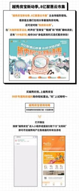 這次的“越秀房寶新動(dòng)季,8億聚惠云市集”主會(huì)場(chǎng),就是深度落地具有互聯(lián)網(wǎng)裂變特點(diǎn)的活動(dòng)的表現(xiàn)?搭佒抵鞑?cè)诰分享最強(qiáng)購(gòu)房攻略,定時(shí)搶“購(gòu)房新動(dòng)券”,在“大咖樣板茶話會(huì)”聽聲優(yōu)趣味講房,還有VR電影院提供360°身臨其境的沉浸式看房體驗(yàn)……
