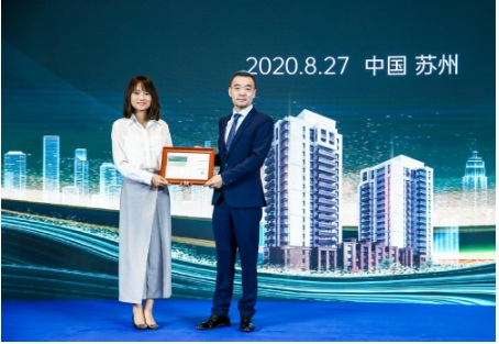 BRE中國(guó)總經(jīng)理李倩(左)向朗詩(shī)綠色生活總經(jīng)理吳旭(右)頒發(fā)證書(shū)