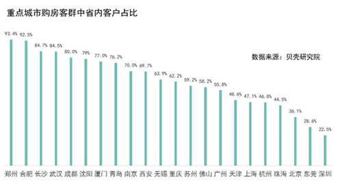 以鄭州為例,作為人口大省河南的省會(huì),其對(duì)各地級(jí)市人口的吸納能力突出,省內(nèi)購房客戶占比達(dá)到93.4%,即每10個(gè)購房客戶中,至少有9個(gè)是河南人。