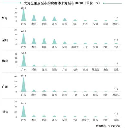 此次發(fā)布的報(bào)告也顯示,憑借較強(qiáng)的經(jīng)濟(jì)發(fā)展活力和寬松的落戶政策,粵港澳大灣區(qū)正吸引著全國各地的人前來置業(yè)定居。貝殼研究院數(shù)據(jù)顯示,湖南、湖北、江西、河南正成為粵港澳大灣區(qū)重點(diǎn)城市新定居居民的輸送大省,其中深圳購房客群中來自這四個(gè)省份的客戶占比為41.6%,在東莞購房客戶中占比45.1%。