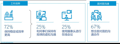 1.首先,員工在家辦公的工作效率是企業(yè)領(lǐng)導(dǎo)最為關(guān)注的問題之一,大部分企業(yè)領(lǐng)導(dǎo)者都擔(dān)心在家辦公將會降低員工的工作效率。然而我們的調(diào)查結(jié)果卻顯示,72%的受訪者認(rèn)為工作效率并沒有因為在家辦公而降低,這其中還有超過30%的人認(rèn)為工作效率是有所上升的。此外,有近一半的人認(rèn)為隨著在家辦公時間的增長,他們越來越適應(yīng)居家環(huán)境,工作效率也會越來越高。同時,我們發(fā)現(xiàn)在居家辦公工作效率穩(wěn)定的受訪者中,25%的人與同事保持著規(guī)律的虛擬溝通。從這個結(jié)果我們可以看出,人們的工作效率能夠保持在一個合理的水平,一方面來自于人們能夠通過自身調(diào)整來適應(yīng)變化的外部環(huán)境這一自然反應(yīng)。另一方面,則來自于和同事間保持的定期的溝通與交流。