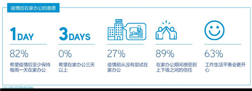 2.在此次調(diào)查的全部受訪者中,我們發(fā)現(xiàn)有接近三成的人在疫情前從來沒有過在家辦公的經(jīng)驗。而在疫情后在家辦公的意愿方面,有82%的受訪者希望在疫情后能夠繼續(xù)保持每周一天在家辦公的頻率,但并沒有人表示希望每周在家辦公的時間超過三天。隨著在家辦公時間的增長,人們開始渴望面對面的工作溝通和合作,也會更加在意工作和生活的平衡。