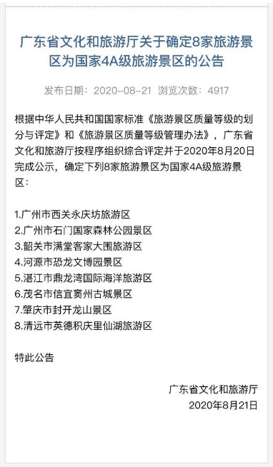 8家旅游景區(qū)為國(guó)家4A級(jí)旅游景區(qū)的公告,