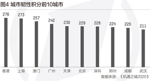 今年的報告,在變量設置上更加強調城市高質量發(fā)展的內(nèi)容,例如城市韌性、可持續(xù)發(fā)展、區(qū)域一體化發(fā)展、城市精細化管理等。“城市韌性”是報告今年重點觀察的維度。香港、上海、澳門、廣州、天津,在這一維度中位列前五。