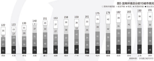 這五座城市分別位于長三角經(jīng)濟區(qū)和粵港澳大灣區(qū)。這兩大城市群是全國經(jīng)濟活力最旺盛、外向型經(jīng)濟最突出的區(qū)域。除中心城市外的其他城市在宜商環(huán)境方面的優(yōu)異表現(xiàn),反映了城市群的帶動作用,也體現(xiàn)了周邊城市更好的承接能力。