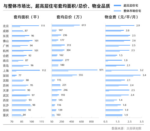 貝殼研究院數(shù)據(jù)顯示,超高層住宅通常具有中高端物業(yè)屬性,與整體市場相比,大部分城市超高層住宅具有凸出的優(yōu)勢:更高的居住品質、更佳的地理位置。