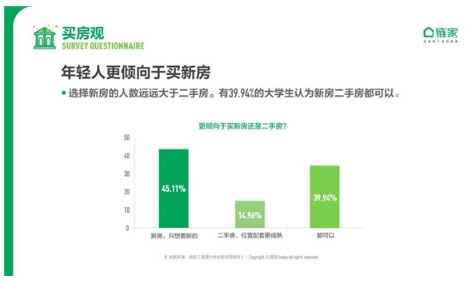 而在首套住房是選擇買(mǎi)新房還是二手房的問(wèn)題上,絕大多數(shù)人都選擇了新房!皥(bào)告”顯示,有45.11%的大學(xué)生選擇只考慮新房,39.94%的大學(xué)生認(rèn)為新房二手房都可以,而只選擇二手房的僅占比14.96%。