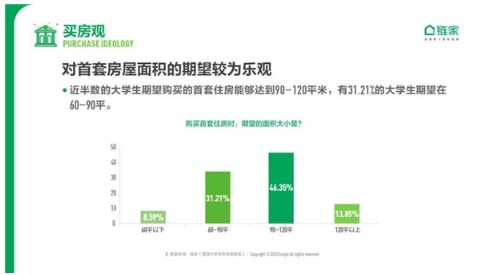 在面對(duì)未來(lái)的置業(yè)買(mǎi)房問(wèn)題上,初入社會(huì)的大學(xué)生們也顯得格外的樂(lè)觀,并呈現(xiàn)出對(duì)生活品質(zhì)的高要求,多數(shù)人期望能在30歲之前擁有首套房,其理想型住房具有“新房、面積較大”等特征。