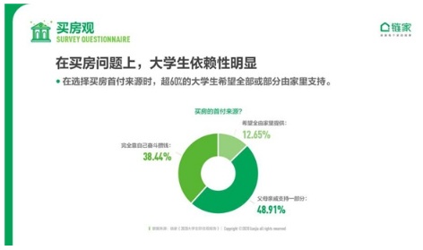 但是,與此同時(shí),報(bào)告顯示,大多數(shù)大學(xué)生對(duì)于置業(yè)問(wèn)題還基本停留在理想狀態(tài),在涉及到敏感的金錢(qián)等問(wèn)題時(shí),接受調(diào)研的大學(xué)生們表現(xiàn)出了明顯的依賴(lài)性,有超過(guò)60%的大學(xué)生希望全部或部分由家里支持首付,有44.73%的人則表示,只可以接受占收入比例10%-30%以?xún)?nèi)的貸款月供。