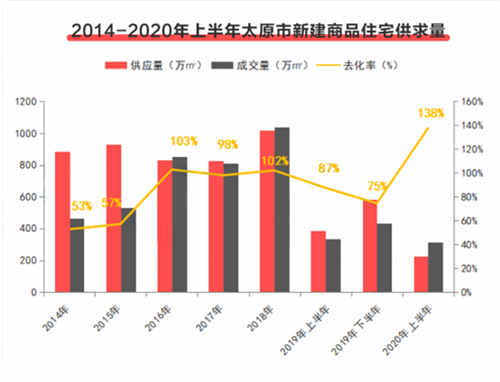 據(jù)樓查查統(tǒng)計(jì)數(shù)據(jù)顯示,2020年上半年太原市新建住宅出現(xiàn)了供應(yīng)面積、成交面積、銷售套數(shù)均同比下降情況,但太原新建商品住宅去化率卻達(dá)到138%,環(huán)比上漲63個(gè)百分點(diǎn);同比上漲51個(gè)百分點(diǎn)。新建商品住宅銷售均價(jià)11176元/平方米,環(huán)比下降1%;同比下降2%。