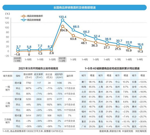 在此背景下,今年樓市“金九”迎來近7年的最差表現(xiàn):無論是新房還是二手房市場,成交量均連續(xù)數(shù)月下跌,且呈擴(kuò)大趨勢;土地市場同樣遇冷,全國300城土地成交面積跌超三成;百強(qiáng)房企中超九成企業(yè)售銷額同比下降,半數(shù)企業(yè)同環(huán)比雙降。