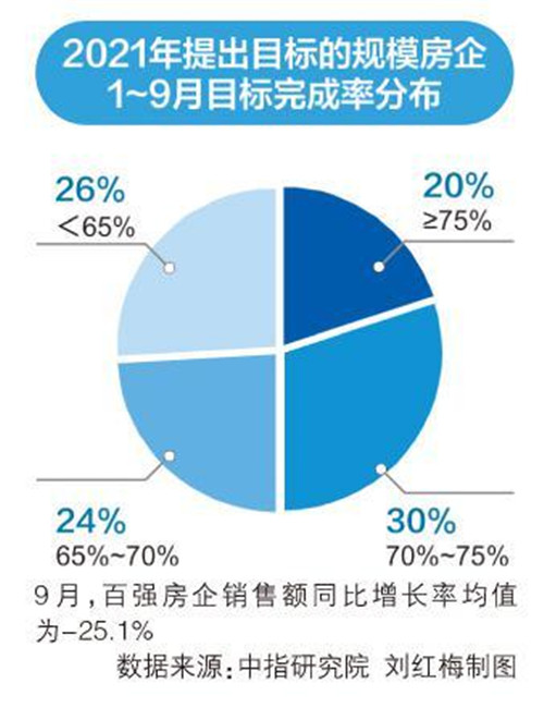 2021年1~9月,TOP100門檻值為229.8億元,但TOP3房企門檻值較上年下降6.3%,為4616.0億元,成為門檻值下降的唯一陣營。同時,房企不同陣營之間增長率繼續(xù)分化。27家1000億元以上“超級陣營”銷售額增長率均值為16.2%;第一陣營(500億~1000億元)共27家,銷售額增長率均值為23.0%;第二陣營(300億~500億元)有27家企業(yè),銷售額增長率均值為21.4%;第三陣營(200億~300億元)和第四陣營(100億~200億元)分別為35家和32家,銷售額增長率均值分別為23.3%和-1.6%。 從前三季度房企整體的目標(biāo)完成情況看,表現(xiàn)整體欠佳?硕鸾y(tǒng)計顯示,在披露年度業(yè)績目標(biāo)的近半數(shù)百強(qiáng)房企中,截至9月末有近兩成企業(yè)的業(yè)績目標(biāo)完成率在75%以上,其中7家企業(yè)目標(biāo)完成率高于80%。
