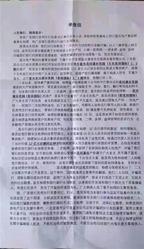 根據(jù)這封寫給央行和銀保監(jiān)會(huì)的“舉報(bào)信”,藍(lán)光楊鏗和該行昆明分行副行長(zhǎng)勾結(jié),進(jìn)行了一起特大金融詐騙。盜用花間溪谷樓盤的大產(chǎn)權(quán),做一房多押、盜押、冒押,詐騙該行的國(guó)家抗疫儲(chǔ)備款55億元。