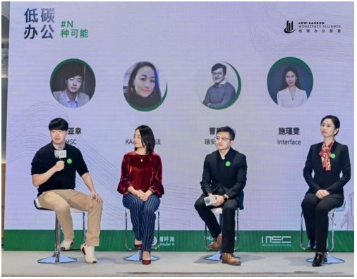 在圓桌討論環(huán)節(jié)中,低碳辦公聯(lián)盟發(fā)起方及首批聯(lián)盟成員代表:瑞安辦公、MSC咨詢、KAFFTEC咖法及Interface就“開啟低碳辦公時(shí)代”話題展開討論。
