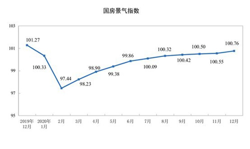 1月18日,國(guó)家統(tǒng)計(jì)局發(fā)布“2020年1-12月全國(guó)房地產(chǎn)開(kāi)發(fā)投資和銷售情況”。其中顯示,商品房供需兩端以及房企到位資金等指標(biāo)均恢復(fù)較快,分別于三、四季度超過(guò)2019年同期。此外,自2020年2月以來(lái),房地產(chǎn)開(kāi)發(fā)景氣指數(shù)(國(guó)房景氣指數(shù))持續(xù)上升,并于12月達(dá)到全年峰值100.76,比11月份提高0.21點(diǎn)。