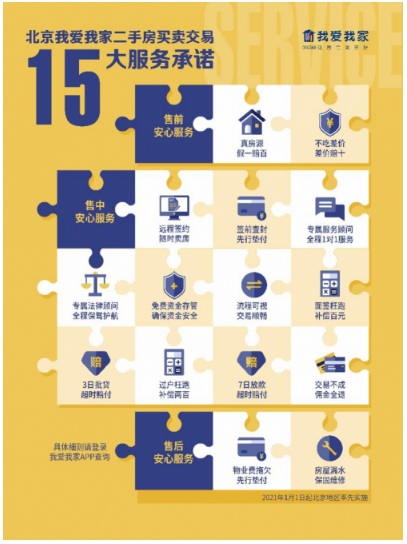2021年伊始,北京我愛我家推出“十五大服務(wù)承諾”,進(jìn)一步實現(xiàn)對二手房買賣交易全流程覆蓋,從售前的房源保真到售中階段的資金安全、履約跟蹤、法律顧問、時效管理、隨時隨地交易,再到售后的欠費墊付、房屋質(zhì)量保障,真正體現(xiàn)了為客戶安全、高效、便捷的購房體驗360度護(hù)航。北京我愛我家成為房地產(chǎn)經(jīng)紀(jì)行業(yè)中服務(wù)項目最全,服務(wù)標(biāo)準(zhǔn)最高的標(biāo)桿型企業(yè)。