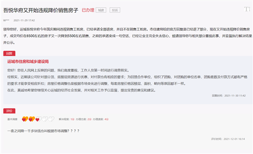 12月6日,澎湃新聞在人民網(wǎng)領(lǐng)導(dǎo)留言板看到,有網(wǎng)友反映,“山西省運城市吾悅?cè)A府今年國慶期間違規(guī)銷售工抵房……現(xiàn)在又開始違規(guī)降價銷售房子,成交均價在6500元左右的房子又一次降到5500元左右銷售。”
