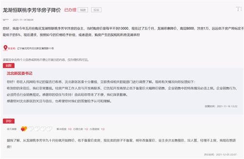 遼寧省沈陽市沈北新區(qū)區(qū)委書記11月16日回復(fù)稱,區(qū)委非常重視,立即責(zé)成相關(guān)職能部門進(jìn)行調(diào)查了解。經(jīng)房產(chǎn)局工作人員與開發(fā)商聯(lián)系,已告知開發(fā)商禁止低于備案價大幅降價銷售,企業(yè)銷售中的特殊情況必須上報。企業(yè)銷售行為,必須符合行業(yè)銷售規(guī)定。