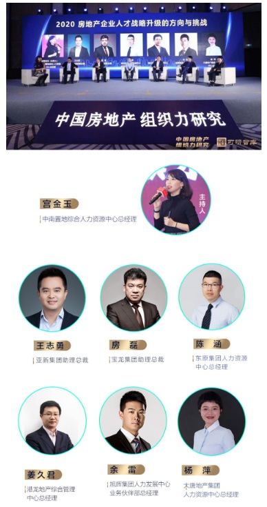 在中南置地綜合人力資源中心總經(jīng)理宮金玉主持下,亞新集團(tuán)助理總裁王志勇、寶龍集團(tuán)助理總裁房磊、東原集團(tuán)人力資源中心總經(jīng)理陳涵、港龍地產(chǎn)綜合管理中心總經(jīng)理姜久君、旭輝集團(tuán)人力發(fā)展中心業(yè)務(wù)伙伴部總經(jīng)理余雷、大唐地產(chǎn)集團(tuán)人力資源中心總經(jīng)理?xiàng)钇家浴?020 房地產(chǎn)企業(yè)人才戰(zhàn)略升級(jí)的方向與挑戰(zhàn)”為議題進(jìn)行了第二場(chǎng)圓桌論壇。
