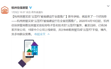 2020年4月10日起,杭州市住保房管局正式推出房屋買賣應(yīng)用電子簽名技術(shù)的“云簽約”服務(wù),實現(xiàn)全程網(wǎng)辦和“不見面簽約”,交易當(dāng)事人可通過手機(jī)端遠(yuǎn)程進(jìn)行身份認(rèn)證、條款協(xié)商、電子簽名確認(rèn)簽約等,打破時間、空間限制,解決群眾至房地產(chǎn)開發(fā)企業(yè)、中介企業(yè)簽約現(xiàn)場簽約的“最后一公里”問題。