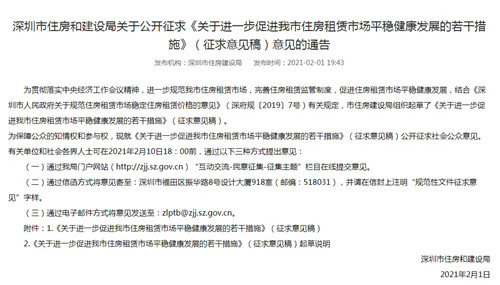 據(jù)“深圳發(fā)布”微信號消息,為進(jìn)一步規(guī)范住房租賃市場行為,深圳市住建局2月1日發(fā)布《關(guān)于進(jìn)一步促進(jìn)我市住房租賃市場平穩(wěn)健康發(fā)展的若干措施》(征求意見稿)(簡稱《若干措施》)!度舾纱胧诽岬,深圳將大力推進(jìn)公共服務(wù)均等化,逐步推進(jìn)租房積分入戶政策與購房享受同等待遇,優(yōu)化租房積分入學(xué)政策。