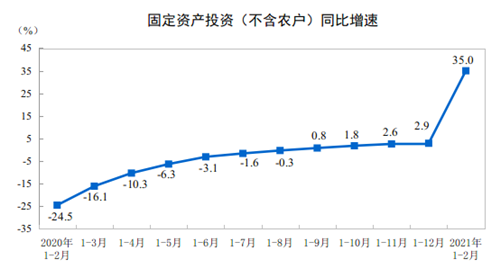 1—2月份,全國固定資產(chǎn)投資(不含農(nóng)戶)45236億元,同比增長35.0%;比2019年1—2月份增長3.5%,兩年平均增速為1.7%。其中,民間固定資產(chǎn)投資26183億元,同比增長36.4%。從環(huán)比速度看,2月份固定資產(chǎn)投資(不含農(nóng)戶)增長2.43%。