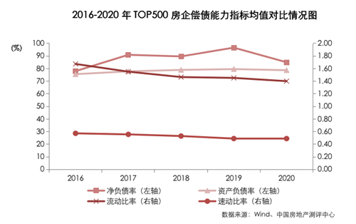 “三道紅線”監(jiān)管下,TOP500房企杠桿率有所降低,降杠桿初顯成效。長期償債能力方面,TOP500房企2020年資產(chǎn)負(fù)債率均值為78.77%,較上年下降0.89個百分點(diǎn),為2012年以來首次下降;凈負(fù)債率均值為85.08%,較上年下降11.62個百分點(diǎn),相比2019年也有大幅改善。短期償債能力方面,2020年TOP500房企短期償債能力略有下降,流動比率均值為1.40,較上年下降0.05,速動比率均值為0.49,與上年持平。