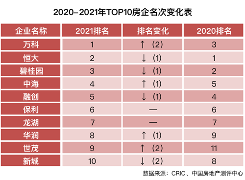 根據(jù)測評報告,2021中國房地產(chǎn)開發(fā)企業(yè)綜合實(shí)力TOP500前三位由萬科、恒大、碧桂園占據(jù)。其中,萬科上升兩位,綜合實(shí)力排名第一,恒大、碧桂園分列二、三。中海、融創(chuàng)、保利、龍湖、華潤、世茂、新城分列四至十位。與2020年相比,2021年TOP10變動率為10%,其中世茂為新晉企業(yè);TOP50的變動率約為10%,整體相對較為穩(wěn)定。
