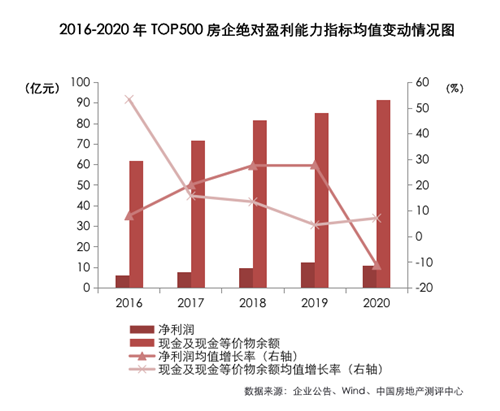 2020年,TOP500房地產(chǎn)開發(fā)企業(yè)總資產(chǎn)收益率均值為1.32%,較上年下降了0.52個百分點(diǎn);凈資產(chǎn)收益率均值為4.53%,較上年下降了4.16個百分點(diǎn);成本費(fèi)用利潤率均值為11.25%,較上年下降了6.75個百分點(diǎn)。利潤空間收窄,房企總資產(chǎn)逐年上漲,尤其近兩年房企的凈利潤增幅不及資產(chǎn)增幅,導(dǎo)致總資產(chǎn)收益率下滑。