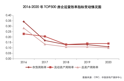 2020年TOP500房地產(chǎn)開發(fā)企業(yè)存貨周轉(zhuǎn)率均值為0.11,較2019年降低0.02;整體流動資產(chǎn)周轉(zhuǎn)率均值為0.14,與2019年持平;總資產(chǎn)周轉(zhuǎn)率均值為0.10,較2019年降低0.01。從三大運(yùn)營指標(biāo)看,總體數(shù)據(jù)依然處于低位。