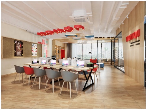 窩趣輕社區(qū)將公共空間命名為“趣堂”,整個(gè)大堂空間突出一個(gè)“趣”的氣息。趣堂的使用者年齡全部都是20—34周歲的白領(lǐng),故在格調(diào)呈現(xiàn)方面需要時(shí)尚、簡(jiǎn)約現(xiàn)代而不失品位、舒適、獨(dú)特、有趣味。大堂的主色調(diào)使用的是紅色,營(yíng)造出一個(gè)年輕活潑、熱情、無(wú)隔閡的社區(qū)氛圍。