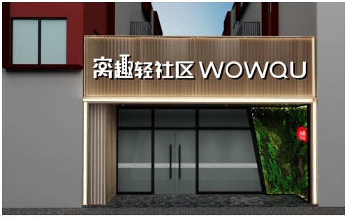 樓頂【窩趣輕社區(qū)WOWQU】紅色LED大字,紅色也深灰色外墻突出“W”的品牌識(shí)別元素