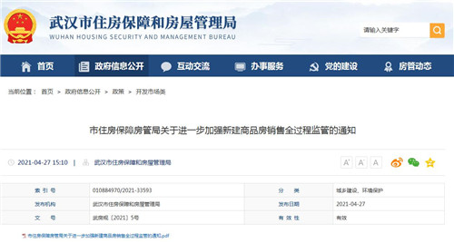 房訊網(wǎng)訊 4月27日,武漢市住房保障和房屋管理局發(fā)布《關(guān)于進(jìn)一步加強(qiáng)新建商品房銷售全過程監(jiān)管的通知》,通過完善和加強(qiáng)新建商品房銷售全過程監(jiān)管制度措施,進(jìn)一步規(guī)范市場主體經(jīng)營行為,激發(fā)市場主體活力,維護(hù)市場良好秩序,促進(jìn)房地產(chǎn)市場平穩(wěn)健康發(fā)展。