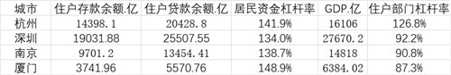 不同地區(qū)、不同城市,居民資金杠桿率、住戶部門杠桿率也呈現(xiàn)較大差別?傮w上,我國城市居民杠桿率呈現(xiàn)南高北低的格局。根據(jù)第一財(cái)經(jīng)記者統(tǒng)計(jì),在重點(diǎn)城市中,廈門、深圳、南京、杭州等東南沿海城市杠桿率較高。