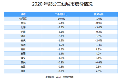 據(jù)國(guó)家統(tǒng)計(jì)局發(fā)布的70城二手房和新房?jī)r(jià)格指數(shù),2020年35個(gè)三線城市中13個(gè)城市二手房?jī)r(jià)格下跌,即使今年一季度有局部“小陽(yáng)春”行情,部分三線城市房?jī)r(jià)下跌的勢(shì)頭并沒(méi)有止住。
