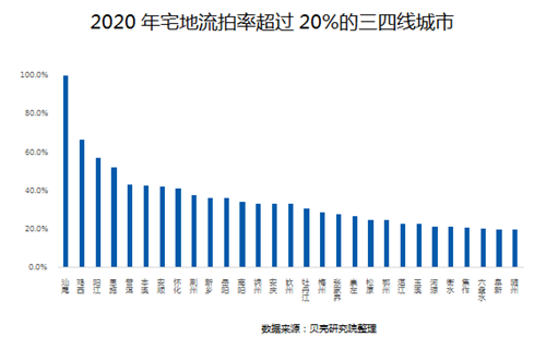 2020年全年,貝殼研究院統(tǒng)計(jì)監(jiān)測(cè)的163個(gè)三四線城市中有123個(gè)城市有土地流拍,占比高達(dá)四分之三。29個(gè)城市的流拍率超過(guò)20%,主要集中在華中(10城)、東北(6城)、廣東(5城)以及云貴桂地區(qū)。除了傳統(tǒng)印象中發(fā)展相對(duì)落后的內(nèi)陸腹地,靠近大灣區(qū)的廣東其他三四線城市也遭遇了地產(chǎn)市場(chǎng)冷卻的情況。