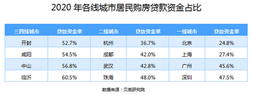 與一二線城市相比,普通三四線城市政策環(huán)境本就寬松,居民購(gòu)房杠桿率遠(yuǎn)高于熱點(diǎn)城市。統(tǒng)計(jì)顯示,三四線城市的貸款資金率要普遍高于一二線城市。如開(kāi)封、咸陽(yáng)、中山、臨沂的貸款資金率分別達(dá)到了52.7%、54.5%、56.8%、60.5%,而北京、上海、廣州、深圳則分別為24.8%、27.4%、45.6%、47.5%。