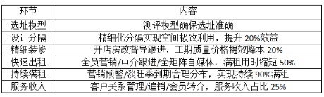 二是時(shí)間,壓縮低價(jià)值的時(shí)間,提升時(shí)間效率,比如不斷降低空間裝修的時(shí)間、招租的時(shí)間、租戶過(guò)渡的時(shí)間;
