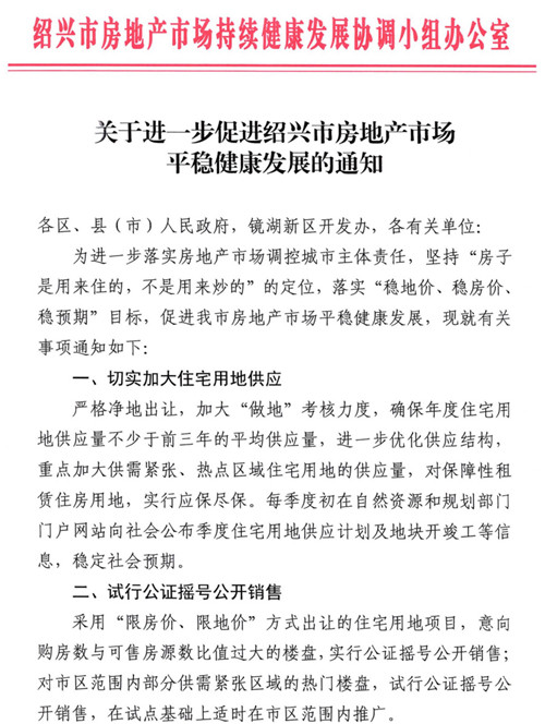 房訊網(wǎng)訊 5月8日,浙江省紹興市房地產(chǎn)市場(chǎng)持續(xù)健康發(fā)展協(xié)調(diào)小組辦公室印發(fā)《關(guān)于進(jìn)一步促進(jìn)紹興市房地產(chǎn)市場(chǎng)平穩(wěn)健康發(fā)展的通知》,從切實(shí)加大住宅用地供應(yīng)、試行公證搖號(hào)公開(kāi)銷售、提高預(yù)售許可條件、建立健全房地聯(lián)動(dòng)機(jī)制、加強(qiáng)房地產(chǎn)秩序整治等方面促進(jìn)房地產(chǎn)市場(chǎng)平穩(wěn)健康發(fā)展。
