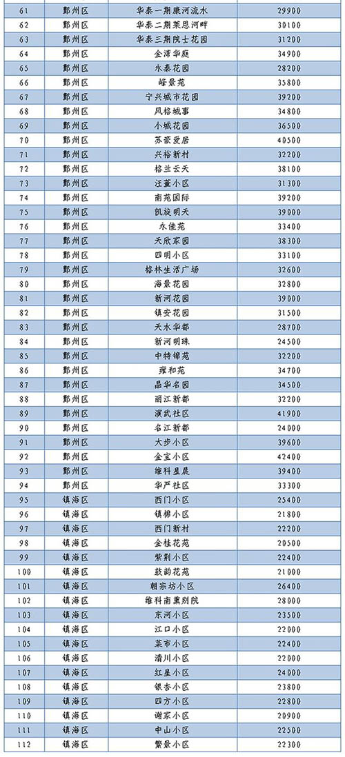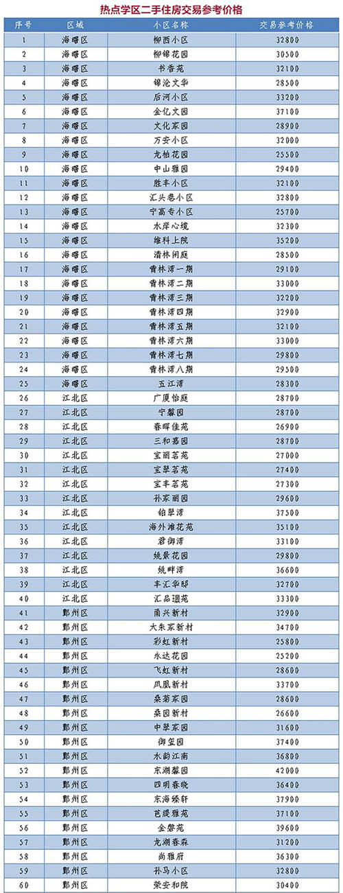 房訊網(wǎng)訊 5月10日,浙江省寧波市住建局發(fā)布消息,為貫徹落實《關(guān)于進(jìn)一步加強(qiáng)房地產(chǎn)市場調(diào)控促進(jìn)房地產(chǎn)市場平穩(wěn)健康發(fā)展的通知》(甬建發(fā)〔2021〕41號)相關(guān)要求,建立熱點學(xué)區(qū)二手住房交易參考價格發(fā)布機(jī)制,促進(jìn)二手住房市場信息透明、理性交易,寧波市先行發(fā)布寧波市實驗小學(xué)、海曙外國語學(xué)校(青林灣校區(qū)、五江口校區(qū))、寧波大學(xué)附屬學(xué)校、華泰小學(xué)(東校區(qū)、西校區(qū))、堇山小學(xué)、宋詔橋小學(xué)、四眼小學(xué)(新河校區(qū))、鎮(zhèn)海區(qū)中心學(xué)校、鎮(zhèn)海應(yīng)行久外語實驗學(xué)校9個熱點學(xué)區(qū)范圍內(nèi),112個小區(qū)的二手住房交易參考價格。