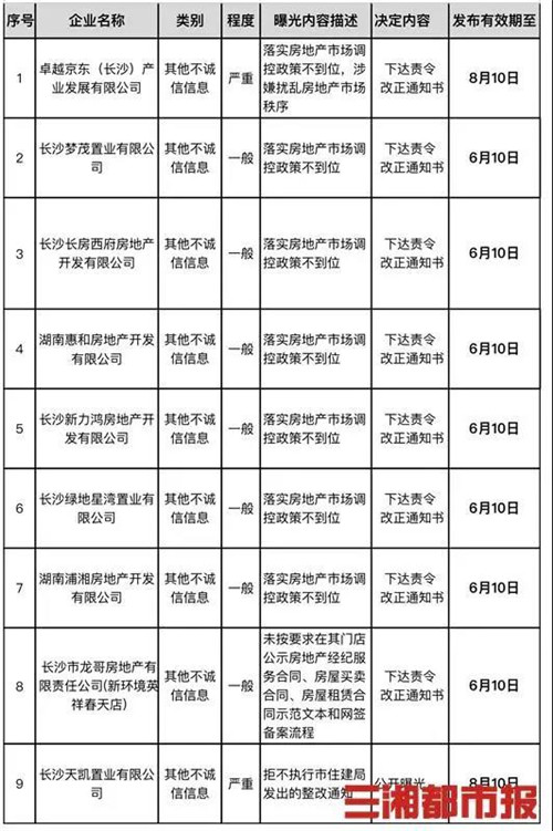 5月11日,長(zhǎng)沙市住建局曝光了4月第二批住建行業(yè)從業(yè)企業(yè)不誠(chéng)信行為。其中,卓越、新力、綠地等7家企業(yè)因落實(shí)房地產(chǎn)市場(chǎng)調(diào)控政策不到位被曝光。針對(duì)不同的不誠(chéng)信行為,長(zhǎng)沙市住建局已經(jīng)下達(dá)了責(zé)令改正通知書,并進(jìn)行公開曝光。